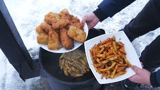 Далее, подготовьте казан. Налейте в него достаточное количество масла и разогрейте его на костре. Когда масло нагреется, выложите в казан кусочки глухаря и начинайте жарить.