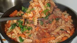 Затем разогрейте сковороду на среднем огне и добавьте немного масла. Выложите на сковороду кабачки и обжаривайте их несколько минут, помешивая время от времени. Когда кабачки станут мягкими, добавьте помидоры и продолжайте готовить еще несколько минут.